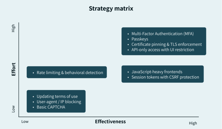Further enhancements could include integrating CAPTCHA systems for sensitive workflows, enforcing HTTPS and TLS protocols, and using Content Security Policy (CSP) headers to limit browser behavior. Financial institutions can also use device-level security and certificate pinning on mobile apps to secure communication channels and detect tampering or emulator-based scraping attempts. When layered strategically, these controls form a resilient perimeter against known and emerging scraping methods.